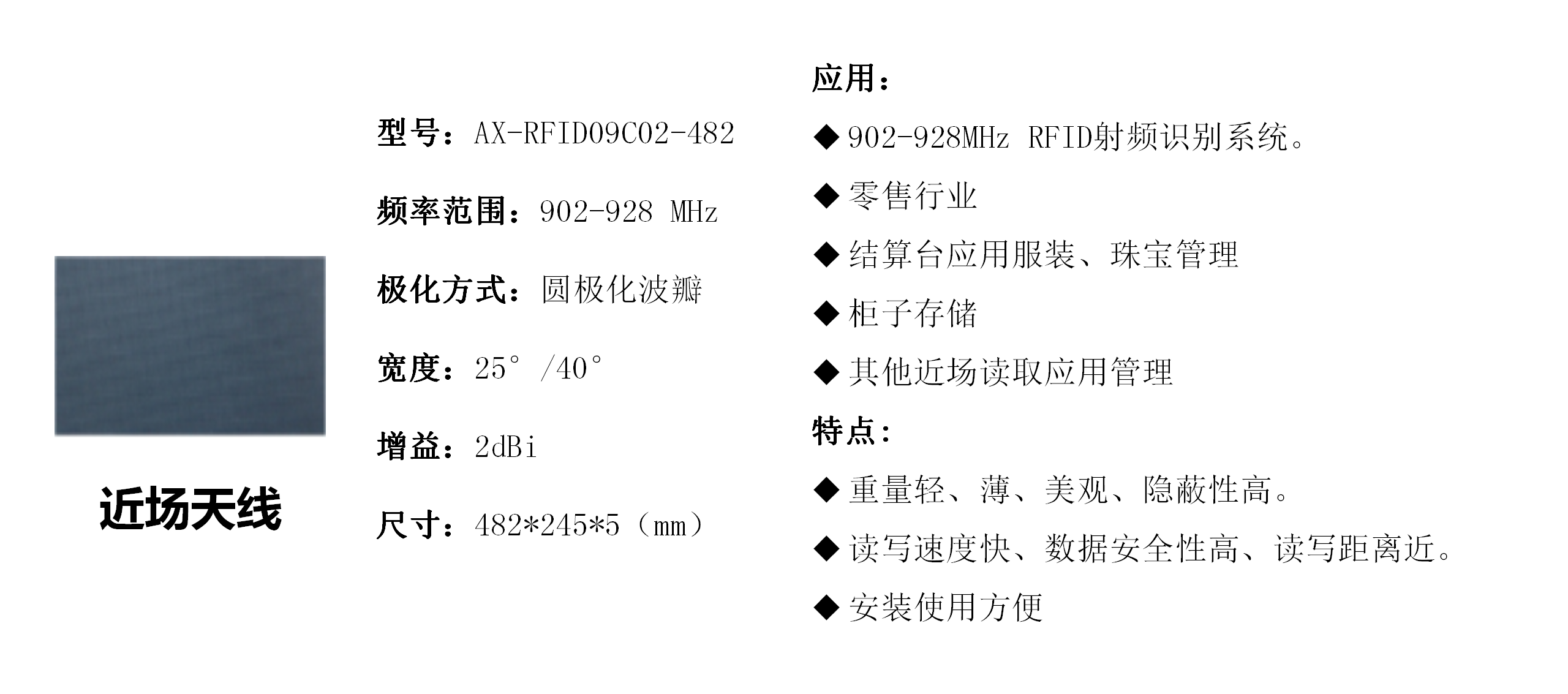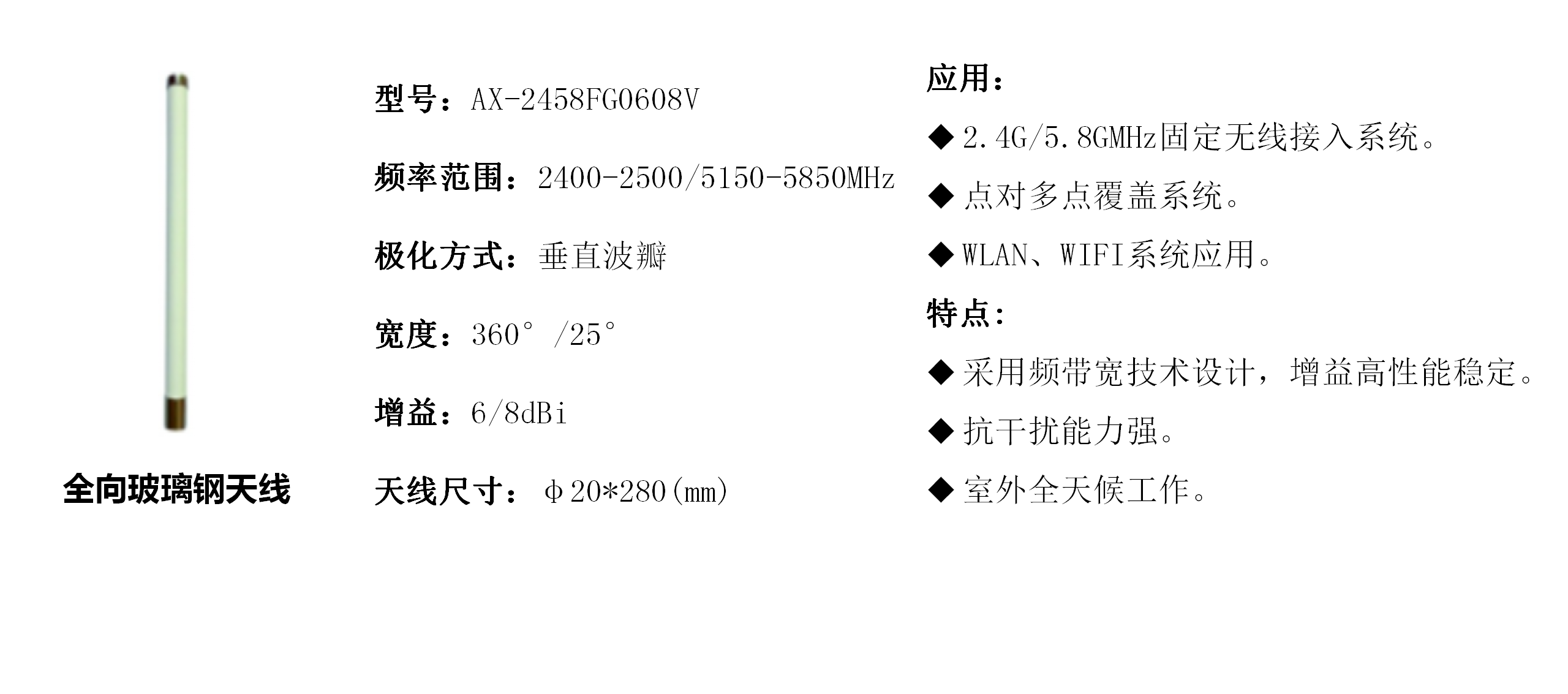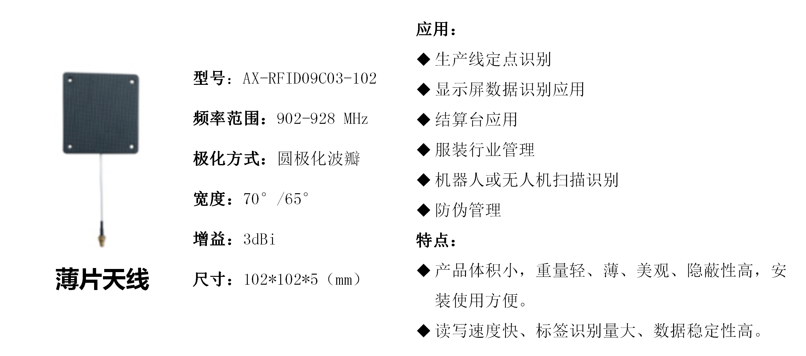 澳信科技与市场同步的产品有:RFID、5G、4G/LTE、LoRa、NB-IoT、WIFI、WIMAX、MIMO、VHF/UHF等无线通信领域的天线及配件。主要应用物联网通信、互联网通信、移动通信、基站通信、军用通信、卫星通信等。实现射频识别、信号覆盖、无线信号传输、数据传输、声像图像传输。